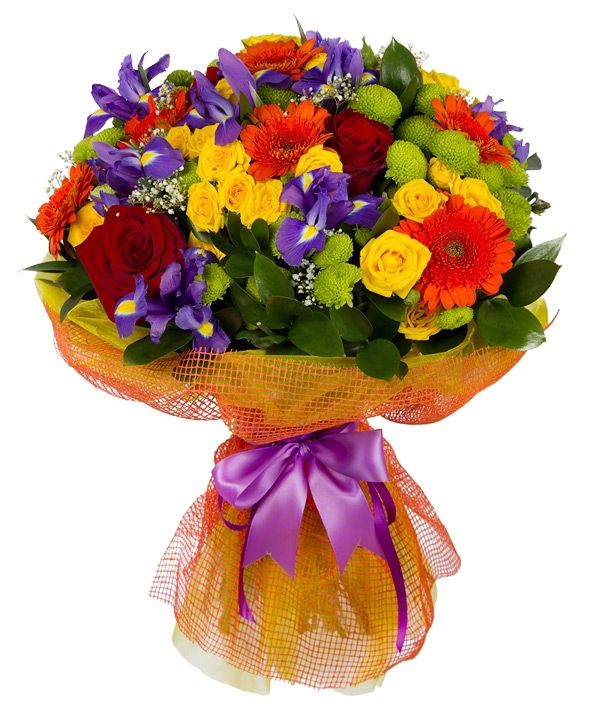7 гербер,5 роз,7 ирисов,3 кустовые розы,4 хризантемы,гипсофила,зелень,упаковка,лента.