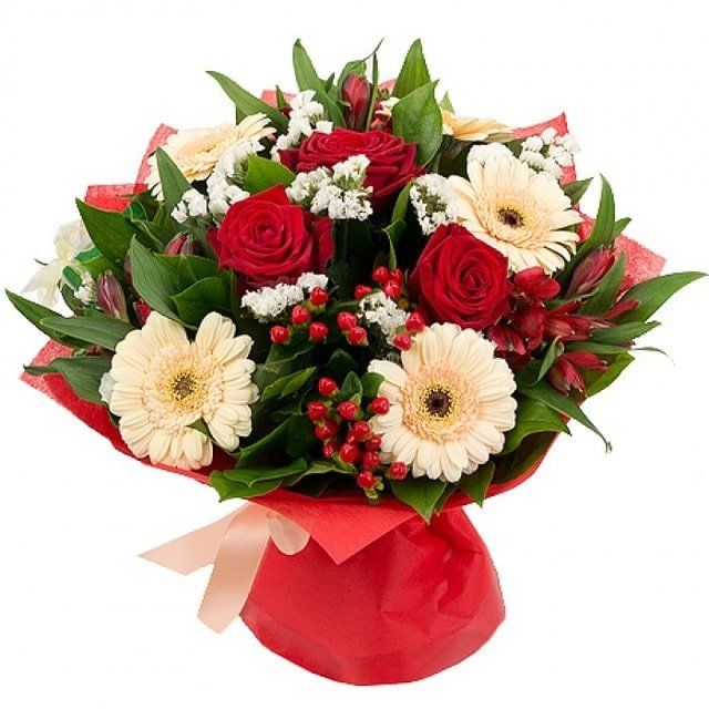 5 гербер,3 розы,4 альстромерии,5 гиперикума,упаковка,лента.