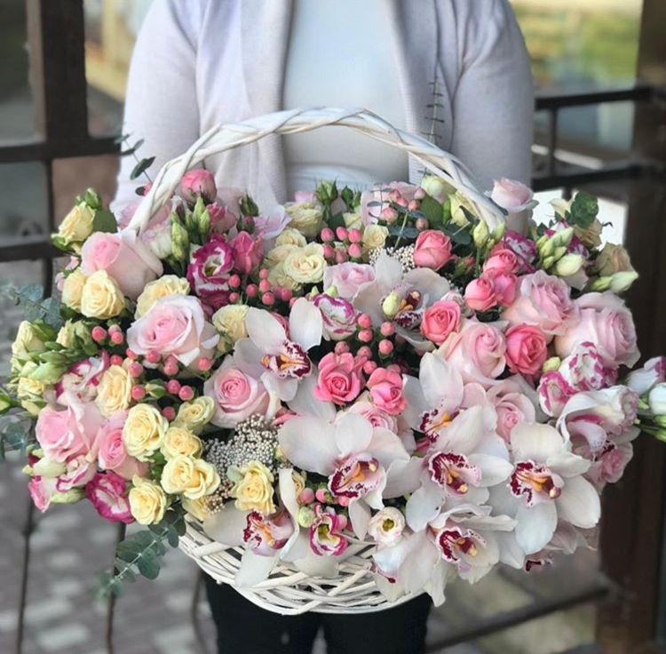 9 орхидей,9 гиперикум,15 роз,7 эустом,10 кустовых роз,зелень,оазис,корзина.