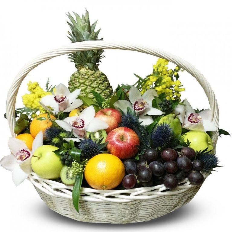 5 орхидей,2 солидаго,зелень,ананас,виоград,яблоки,киви,апельсин,груша.