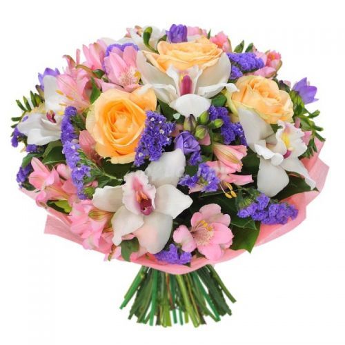 5 орхидей,3 розы,4 альстромерии,2 статицы,зелень,упаковка.