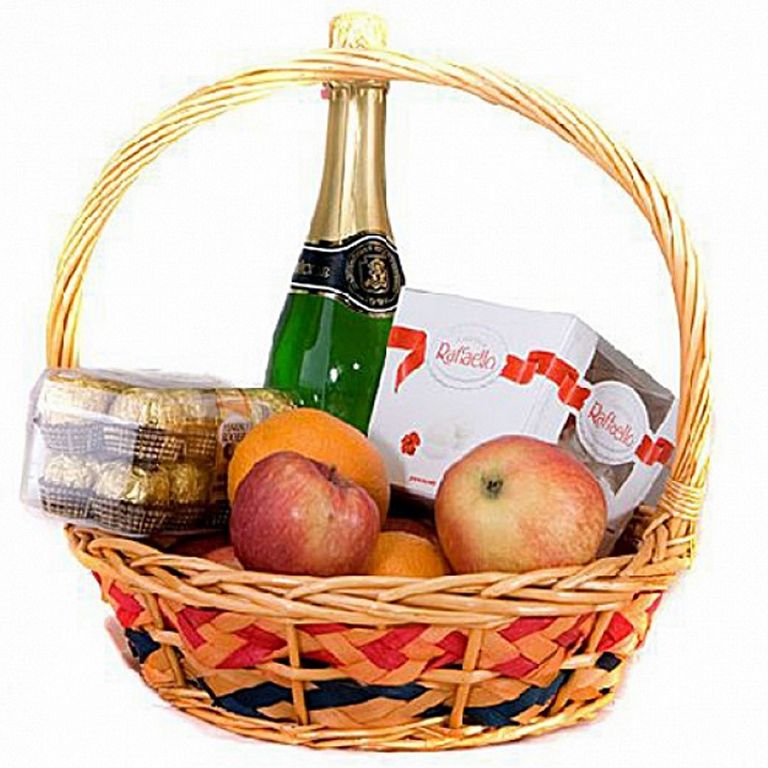 Шампанское Российское,конфеты Раффаэло,Коркунов,яблоки,апельсины.