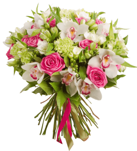 7 орхидей,9 роз,3 альстромерии,2 эустомы,5 диантуса,зелень,лента.