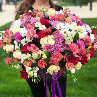 25 роз,10 хризантем,10 кустовых роз,10 альстромерий,7 эустом,5 гвоздик,зеленьлента.