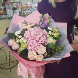 1 гортензия,3 кустовых розы,2 эустомы,2 альстромерии,зелень,упаковка.